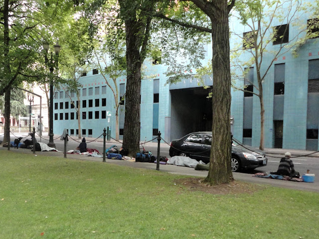 Los "homeless" en la plaza eran bastantes, ya que al cabo de unos momentos les fue repartido un plato de comida por unos voluntarios. Es una imagen que llevo viendo en toda la Costa desde Los Ángeles, San Francisco y Portland, y a la que uno no acaba de acostumbrarse ya que, por suerte, en nuestra casa es un fenómeno mucho más puntual.